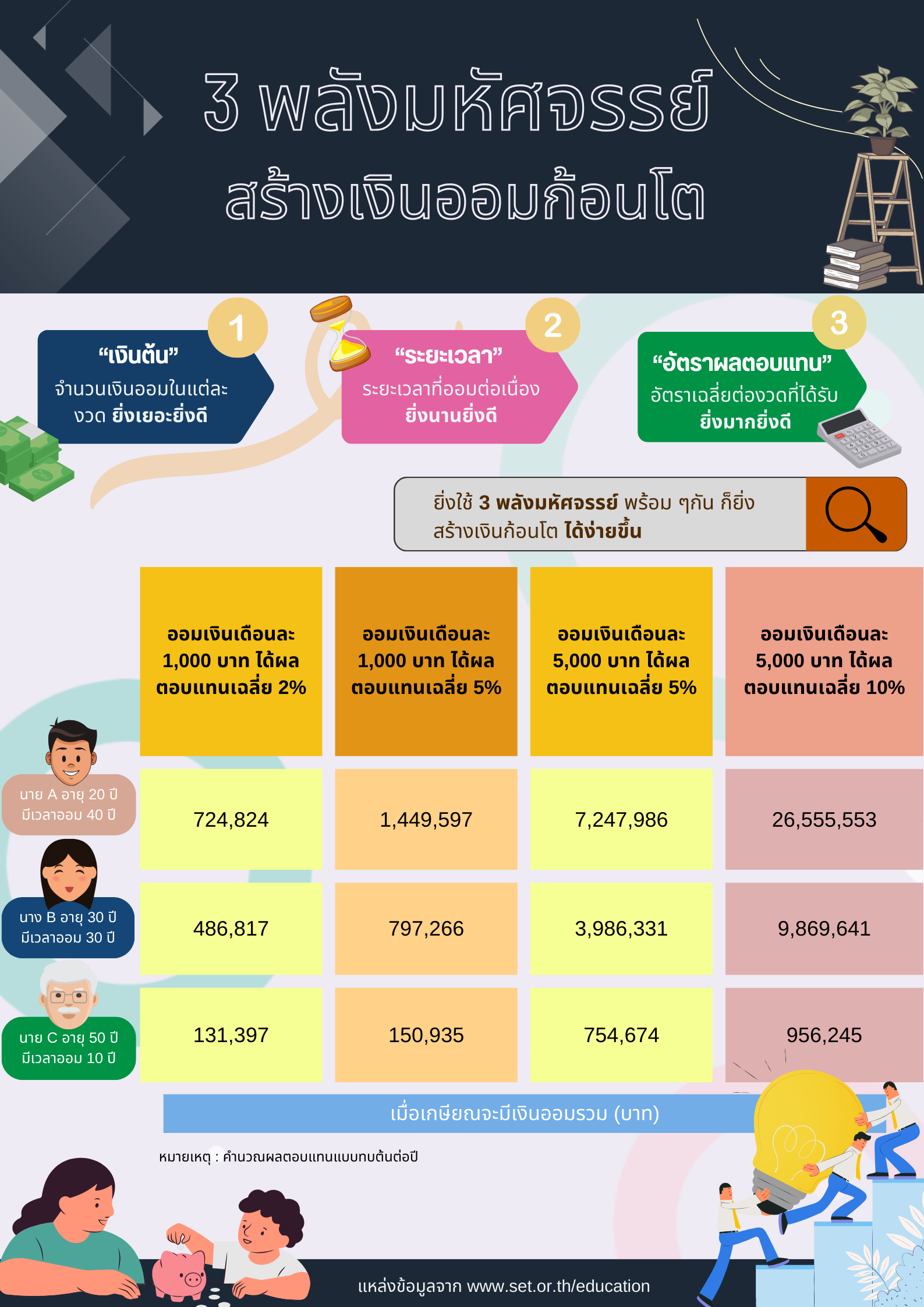 การออมเงินเป็นหนึ่งในวิธีที่ดีที่สุดในการสร้างความมั่นคงทางการเงินในอนาคต การออมเงินต้องมีการวางแผนและความมุ่งมั่ง โดยมี 3 ปัจจัยหลักที่ควรคำนึงถึง ได้แก่ เงินต้น, ระยะเวลา, และอัตราผลตอบแทน